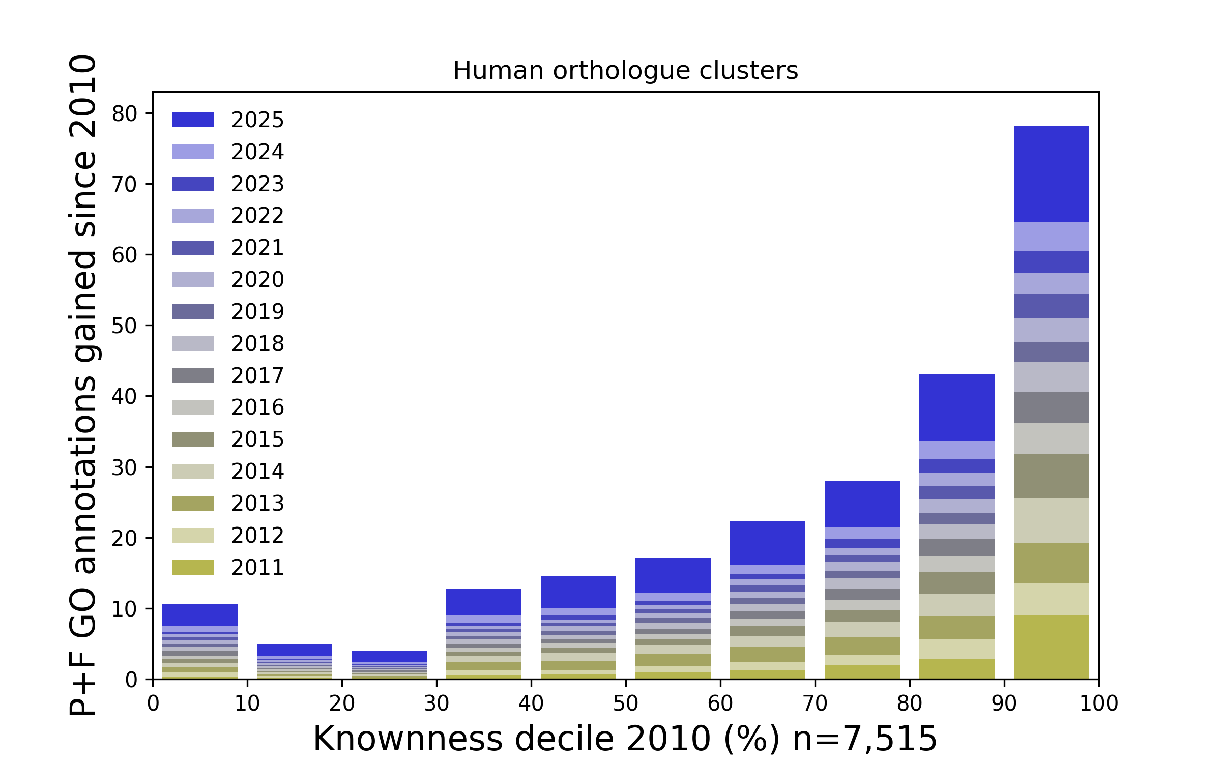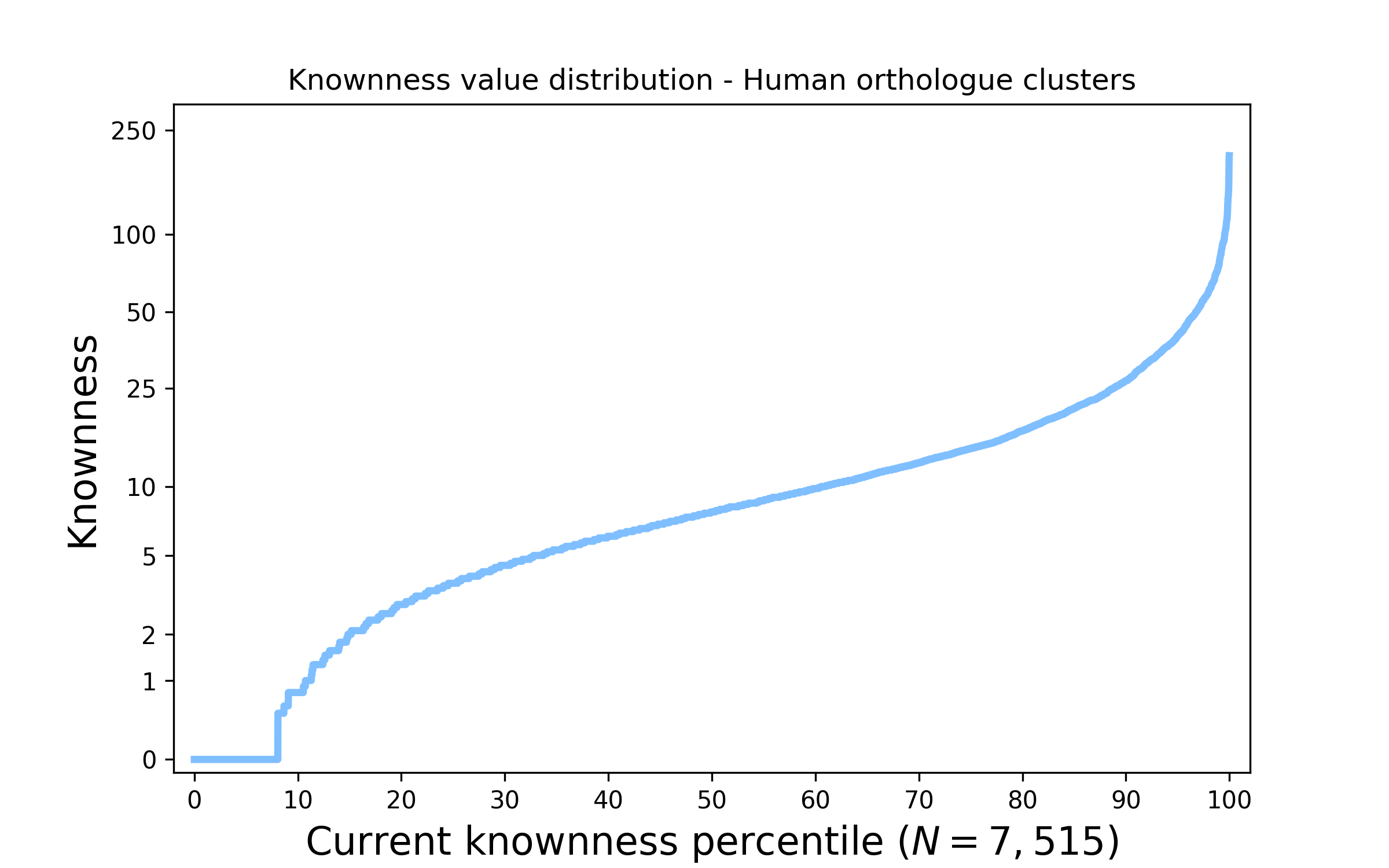 The overall principle of the unknome database is to assign a knownness score to proteins. Each protein is placed in a cluster of orthologues based on the Panther database. The knowness score is defined as the largest number of Gene Ontology (GO) terms that has been assigned to a member of that cluster. Because GO annotations vary in confidence and relevance to function, different types of evidence can be assigned a different weight when calculating the score. The list of scored clusters can also be restricted to those containing proteins from humans and/or the main model organisms.